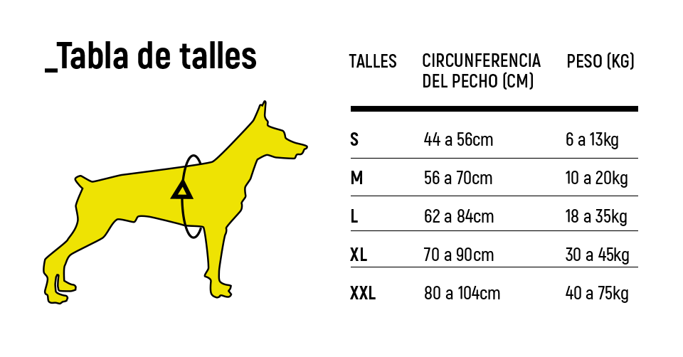 / Importante: Medir la circunferencia del perro, como indica la foto de talles, para seleccionar el talle correcto, para su mascota. Los parches no están incluídos.